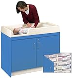 Efficient Changing Table with Storage Trays Easy to clean molded top 7 Deep safety changing surface prevents infant from rolling out Roll paper dispenser with changing paper Double door locking cabinet Doors conceal Racks with 12 Individual 3 Deep Clear Bins Clear bins allow user to quickly access products Label bins with child's name for reference Laminate surfaces are easy to clean and scratch resistant Child friendly radiused corners and edges Durable 3/4'' Thick material with wood Dowel Pins and Bolt-Thru Construction Extra deep base provides added stability to prevent tipping Pearl Interior with Frame Color Option Ships Assembled Optional Changing Pad