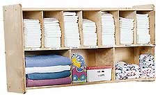 This open, easy-access, storage cabinet has substantial space for diapers and other sanitary clean-up supplies. Mounts horizontal on the wall (as shown) or stands vertical against the Changing Island on the floor. Rugged Baltic Birch construction with a high gloss UV finish. Measures 41" x 9 1/2" x 22". Weighs 52 lbs.